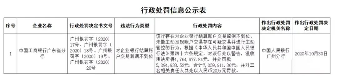 近期,为更好配合广东省公安厅打击治理电信网络诈骗,人民银行广州分行成立了专项工作组,根据公安机关移交的“涉案”账户,对相关银行、支付机构及其责任人开展倒查,对内部管理混乱、账户管理薄弱的机构采取通报、约谈责任人、现场检查等措施,并对违规行为情节严重的依法依规进行行政处罚。其中,中国工商银行广东省分行因存在“对企业银行结算账户交易监测不到位,未按规定发现账户交易存在可疑交易并进行主动管控”等问题,被处以警告并罚款及没收违法所得合计人民币7,059,911.36元,三名相关责任人被警告并处以罚款合计人民币20万元。同时,中国工商银行广州市分行9个网点被暂停办理企业银行结算账户开立业务6个月,并限期整改。