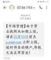四川简阳市企业反映,有不法分子通过短信向企业和群众以“营业执照未如期上报”为名,诱惑点击非法钓鱼网站链接。