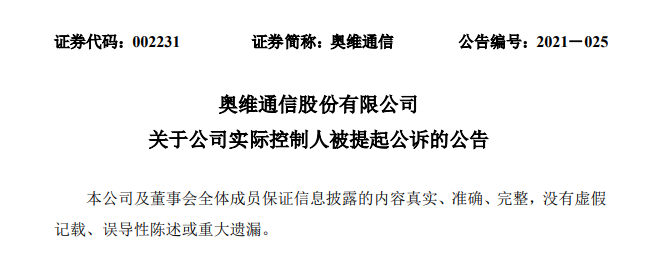 公告显示,奥维通信股份有限公司(下称“奥维通讯”)于近日在中国庭审公开网查询获悉,公司实际控制人单川先生因涉嫌虚开增值税发票,用于骗取出口退税、抵扣税款发票罪被北京市人民检察院第三分院提起公诉,目前案件尚在北京市第三中级人民法院进一步审理中。