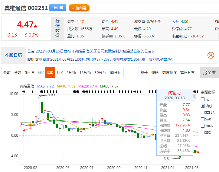 截至今日收盘,奥维通信涨幅3%,报4.47元/股,较去年3月的高点9.83元腰斩。