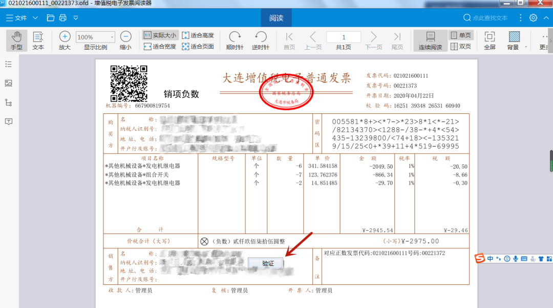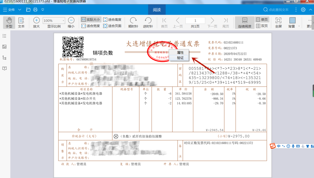 第二步,在阅读器里进行“打开”操作,选择已经下载好的增值税电子普通发票版式文件;也可以直接鼠标双击已下载好的增值税电子普通发票版式文件打开。将鼠标移至增值税电子普通发票“发票监制章”区域内,点击鼠标右键,选择“验证”功能,如下图所示。