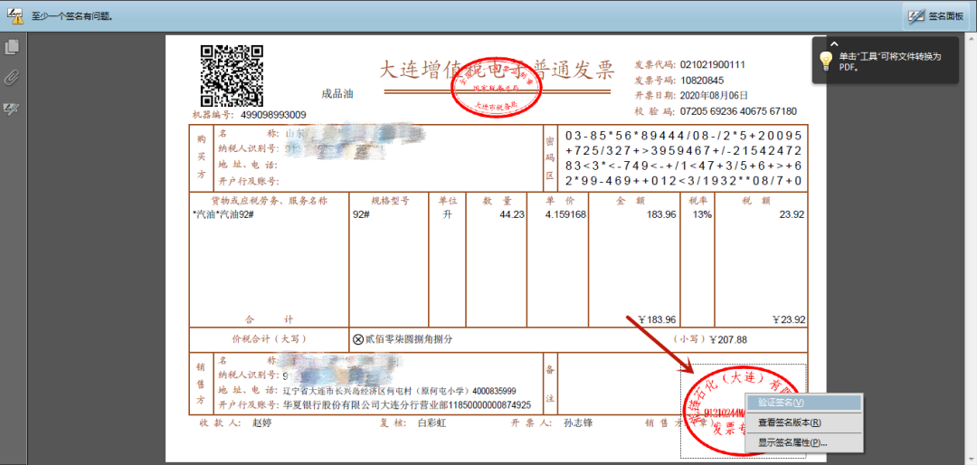 第四步,验证发票监制章有效后,鼠标移动到左下角销方信息处,点击右键,弹出提示框,如下图所示,点击“验证”,弹出验证结果。
