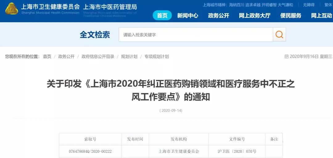 9月14日上海市卫健委发布了关于《上海市2020年纠正医药购销领域和医疗服务中不正之风工作要点》的通知。进一步贯彻落实本市“九不准”“十项不得”和整治医药产品回扣“1+7”系列