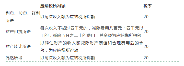 每次收入不超过四千元的,减除费用按八百元计算;每次收入四千元以上的,减除费用按收入的百分之二十计算。劳务报酬所得、稿酬所得、特许权使用费所得,以每次收入额为预扣预缴应纳税所得额,计算应预扣预缴税额。劳务报酬所得适用个人所得税预扣率表二(见下表),稿酬所得、特许权使用费所得适用百分之二十的比例预扣率。扣缴义务人向非居民个人支付工资、薪金所得,劳务报酬所得,稿酬所得和特许权使用费所得时,应当按照以下方法按月或者按次代扣代缴税款:非居民个人的工资、薪金所得,以每月收入额减除费用五千元后的余额为应纳税所得额;劳务报酬所得、稿酬所得、特许权使用费所得,以每次收入额为应纳税所得额,适用个人所得税税率表三(见下表)计算应纳税额。劳务报酬所得、稿酬所得、特许权使用费所得以收入减除百分之二十的费用后的余额为收入额。其中,稿酬所得的收入额减按百分之七十计算。