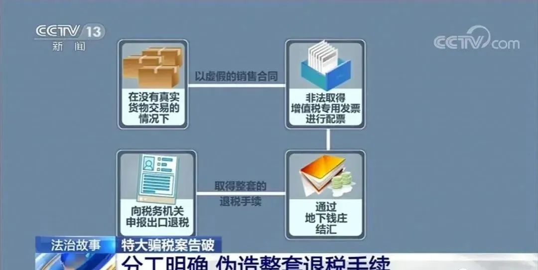 调查过程中,我们发现以刘某为首的具有地域性特征的一个骗税团伙。我们通过碰撞票流、资金流,以及大数据平台的数据,把骗税团伙人员架构和公司架构逐步梳理出来。通过对刘某的调查,警方逐渐掌握了涉及这一案件的上下游企业,以及100多个对公对私银行账号。他们发现,这一案件上游企业分布在江苏、江西、山东、河南等多个省份,而刘某只是这起骗税案件的一环,它的上游还有数个专门从事发票虚开的犯罪团伙,在它的下游还有专门提供服务的不法货代和地下钱庄。这些犯罪嫌疑人分工明确,各自只负责自己的环节,在没有真实货物交易的情况下,以虚假的销售合同,非法取得增值税专用发票进行配票,然后再通过地下钱庄结汇,最终取得整套退税手续,并向税务机关申报出口退税。